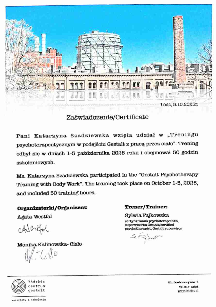 Ukończyłam 4-letnie Studium Psychoterapii w Polskim Instytucie Psychoterapii Integratywnej w Krakowie, który składał się z 1741h. Przestrzegam kodeksu etycznego Polskiego Towarzystwa Psychoterapii Integratywnej, którego jestem członkiem, a swoją pracę poddaję regularnej superwizji.